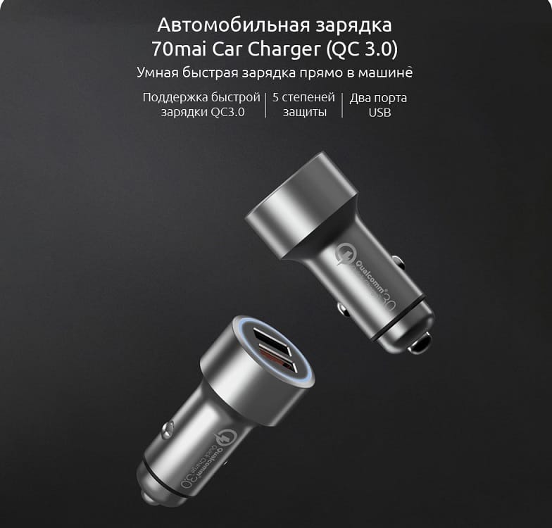 Зарядное устройство 70mai может работать в автомобилях с напряжением 12 или 24 В, оно подходит для абсолютного большинства существующих легковых автомобилей, внедорожников и даже грузовых автомобилей.