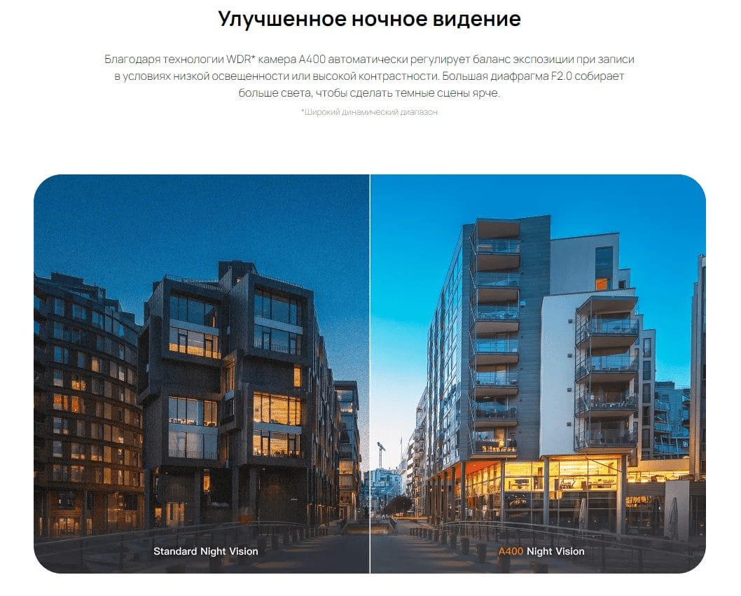Благодаря технологии WDR* камера A400 автоматически регулирует баланс экспозиции при записи в условиях низкой освещенности или высокой контрастности. Большая диафрагма F2.0 собирает больше света, чтобы сделать темные сцены ярче.