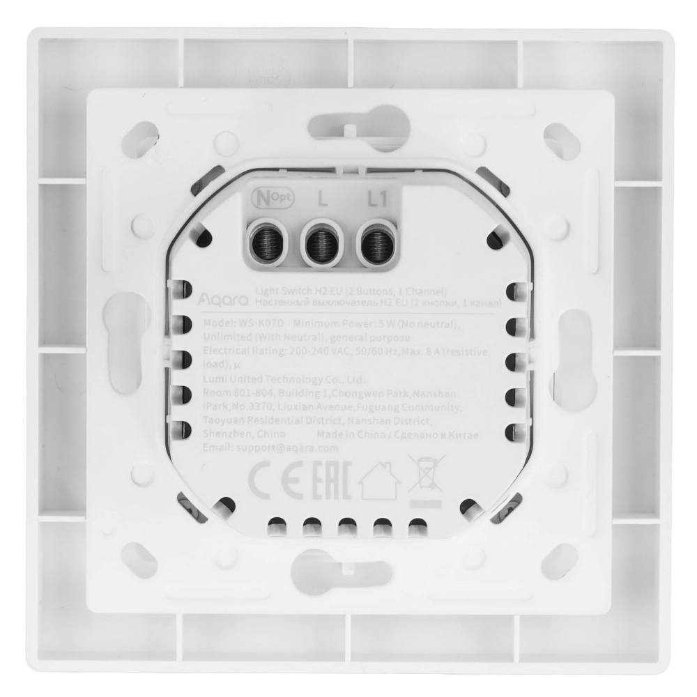 Умный выключатель Aqara H2 WS-K07D — решение для автоматизации освещения, поддерживающее управление через приложение Aqara Home (требуется хаб с Zigbee 3.0), интеграцию с Apple HomeKit и Яндекс Алисой (через облачную интеграцию и хаб Aqara), работу по протоколам Zigbee 3.0 и Matter over Thread. Позволяет удалённо включать/выключать свет, настраивать сценарии и таймеры. Максимальная нагрузка — до 1920 Вт (до 8 А), минимальная — от 5 Вт при отсутствии нейтрального провода. Опциональное подключение нейтрали расширяет возможности: становится доступен мониторинг энергопотребления и защита от перегрузки. Размеры — 86 × 86 × 45 мм, совместим со стандартными рамками выключателей 55 мм. Каждая клавиша имеет две зоны нажатия для расширенных автоматизаций.