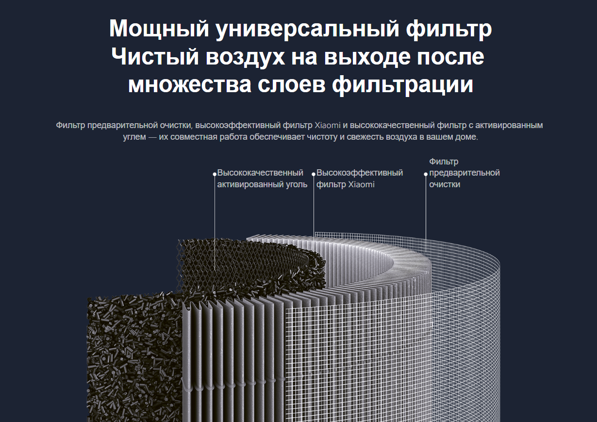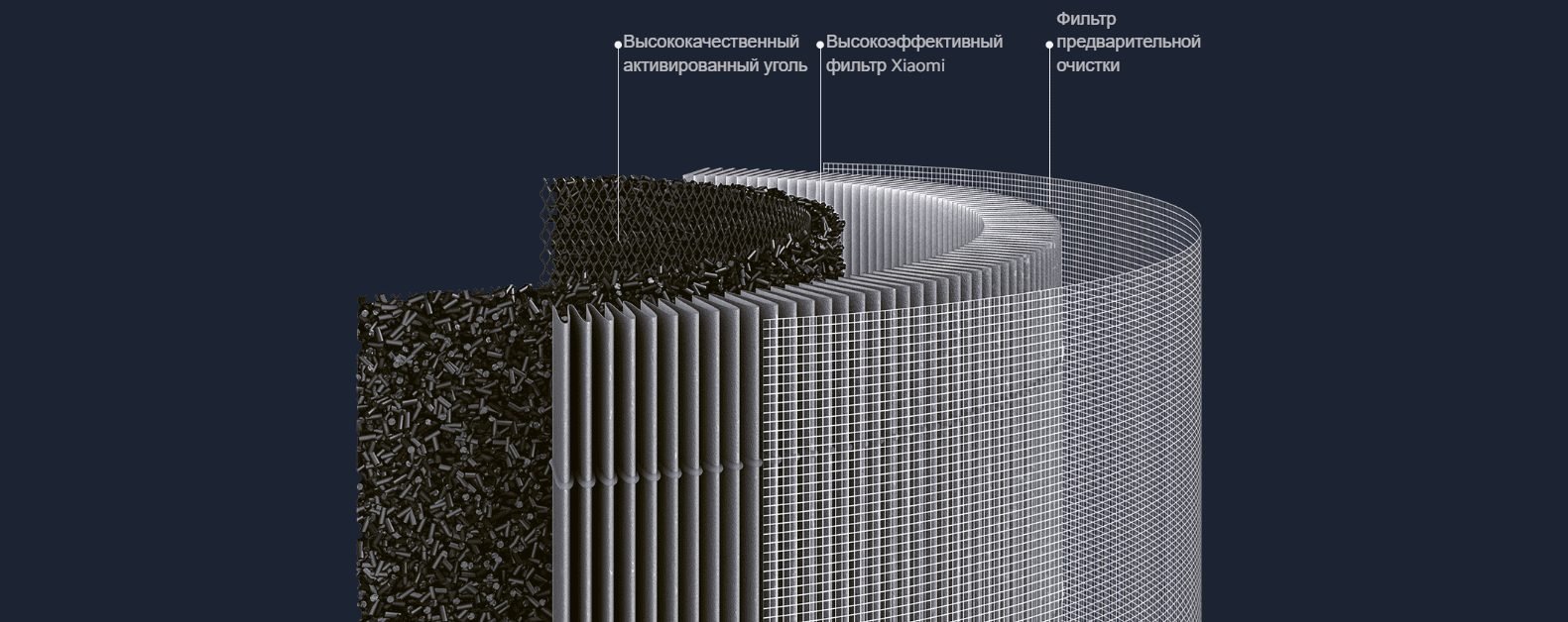 Фильтр предварительной очистки, высокоэффективный фильтр Xiaomi и высококачественный фильтр с активированным углем — их совместная работа обеспечивает чистоту и свежесть воздуха в вашем доме.