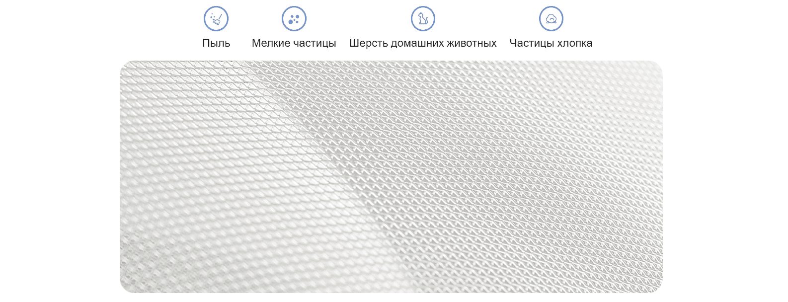 Две технологии фильтрации. Электростатический заряд и механическая фильтрация — высокоэффективный фильтр Xiaomi может удалять до 99,97% содержащихся в воздухе частиц размером 0,3 мкм, а также задерживает пыль, частицы PM2.5, пыльцу, перхоть домашних животных, табачный дым и мельчайшие частицы.