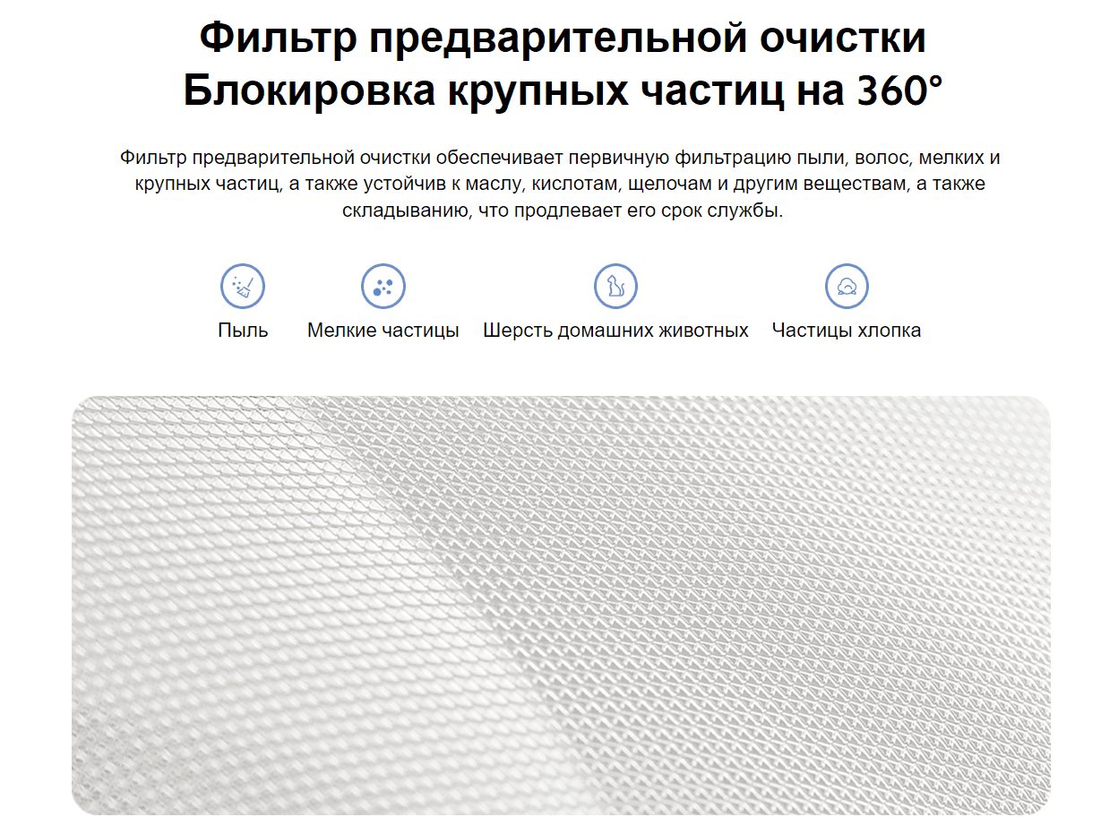 Фильтр предварительной очистки обеспечивает первичную фильтрацию пыли, волос, мелких и крупных частиц, а также устойчив к маслу, кислотам, щелочам и другим веществам, а также складыванию, что продлевает его срок службы.