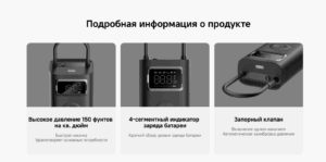 Xiaomi Portable Electric Air Compressor 2 Pro очень удобный и компактный компрессор который можно брать в длительные путешествия на машине. Полная накачка происходит за наикротчайшее время 45 секунд. Это происходит благодаря цилиндрам из литого сплава и диаметром 27 мм. Компрессор имеет длительную автономную работу. Можно накачать 16 автомобильных шин подряд. В прибор еще встроенно несколько режимов для определенного вида транспорта или вещи (машины, велосипеды, мотоциклы, самокаты и мячи). Если ни один из них не подходит, то можно воспользоваться пользовательским режимом с диапазоном 3-150 фунтов на кв. дюйм