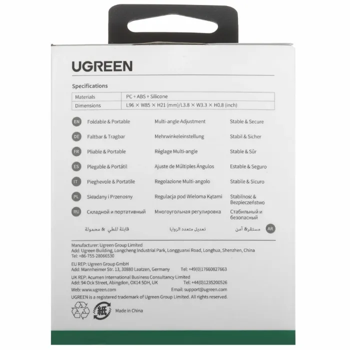 Откройте для себя новый уровень удобства и эргономики с универсальной портативной подставкой UGREEN LP106. Разработанная для тех, кто ценит комфорт, функциональность и минималистичный дизайн, эта подставка станет незаменимым аксессуаром для вашего смартфона, планшета или даже электронной книги.