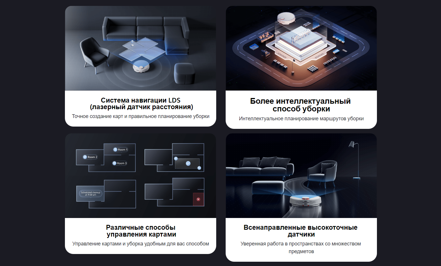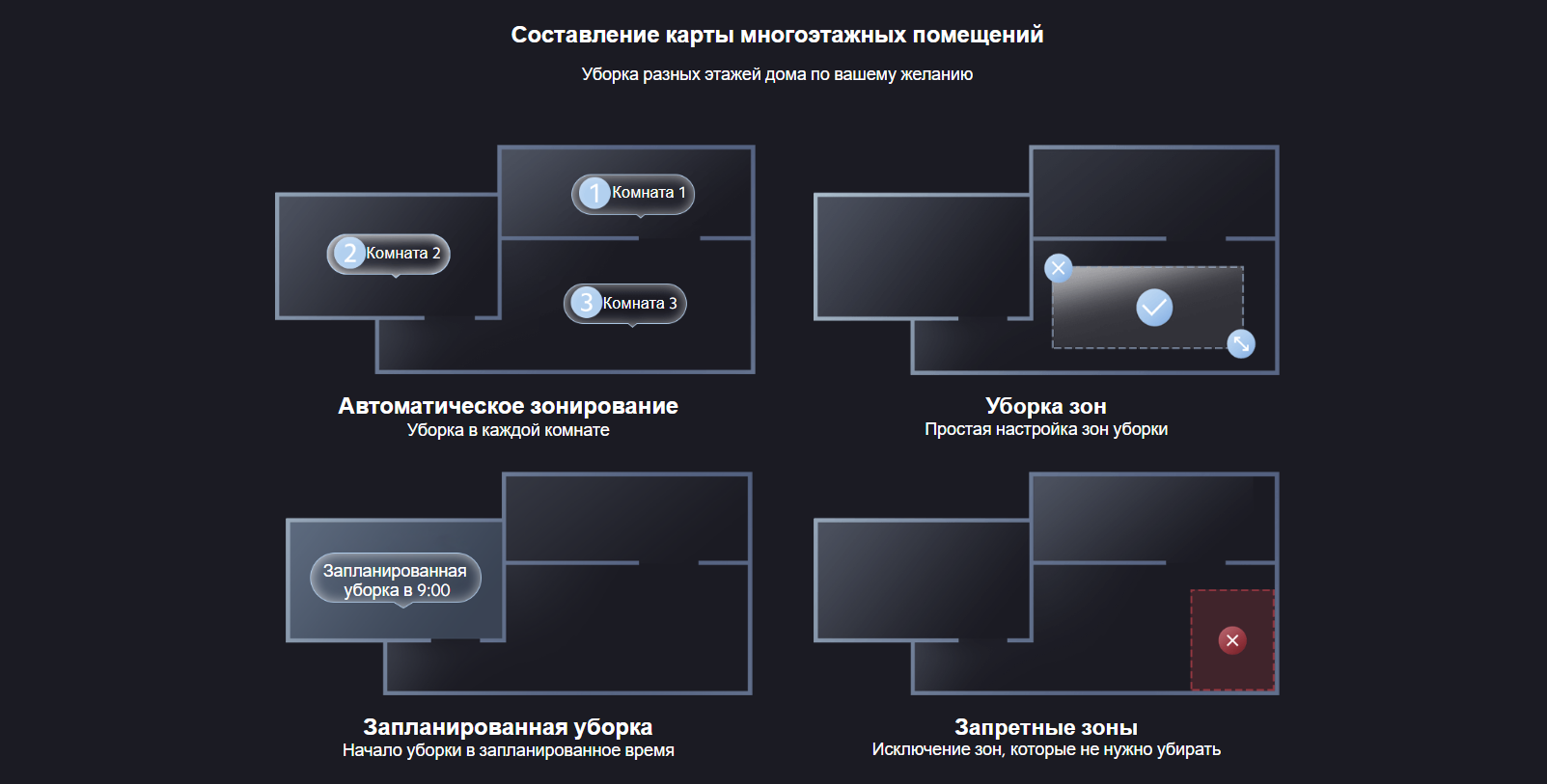 Робот-пылесос может автоматически разделять помещения на зоны во время первой очистки, также поддерживается уборка отдельных зон и установка запретные зоны для комплексного управления.