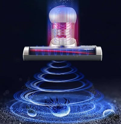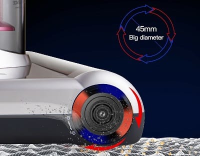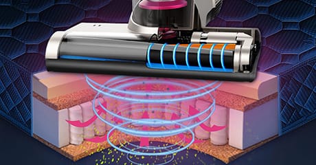 Благодаря встроенной в щетку мягкой резиновой полосе, производящей 62000 ударов в минуту, пылесос легко собирает мелкую пыль и клещей, не повреждая очищаемую поверхность.