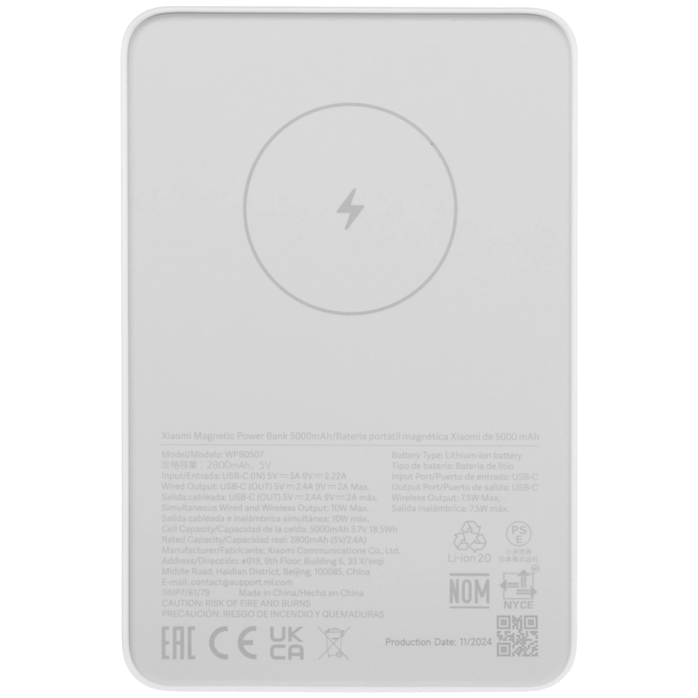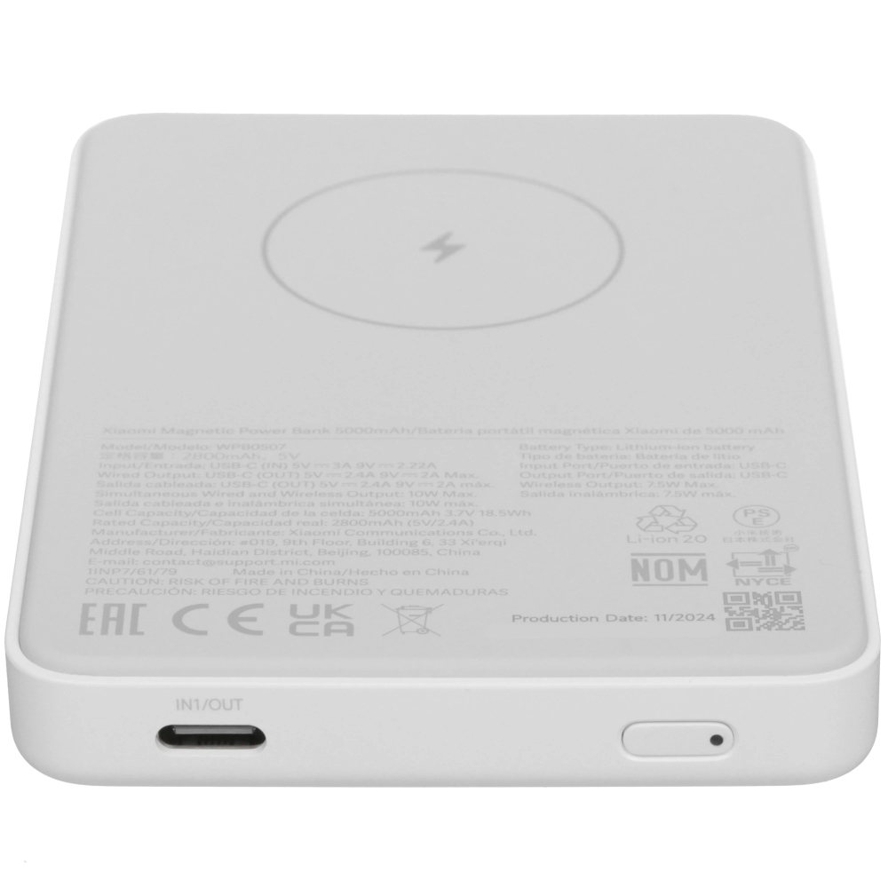 Внешний аккумулятор Xiaomi Magnetic Power Bank 5000mAh GL (BHR9303GL) — компактный источник энергии для гаджетов с ёмкостью 5000 мАч и поддержкой быстрой зарядки мощностью до 18 Вт. Оснащён магнитным креплением с силой притяжения 10 Н, позволяющим надёжно фиксировать устройство на смартфоне (в том числе с чехлом MagSafe), не блокируя камеру. Поддерживает два режима зарядки: проводной (через USB Type-C, макс. ток 2.4 А) и беспроводной (стандарт Qi, мощность до 7.5 Вт). Корпус ультратонкий (12 мм), выполнен из белого пластика. Устройство защищено от короткого замыкания, перегрева, перегрузки и перенапряжения. В комплект входит кабель для зарядки и документация. Индикатор уровня заряда позволяет отслеживать оставшийся ресурс батареи. Идеален для подзарядки смартфонов в дороге — сочетает удобство, надёжность и современный дизайн.